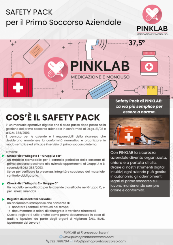 Il Safety Pack PINKLAB ti fornisce tutto ciò che serve per mantenere la tua azienda conforme al D.M. 388/2003, con qualità e precisione.